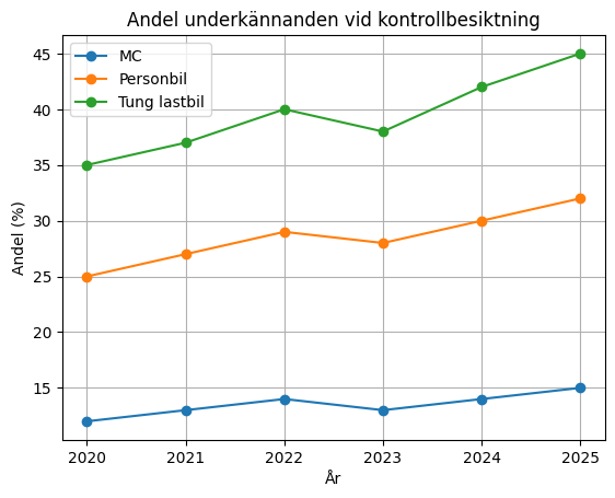 Samtidigt visar utvecklingen över tid att andelen underkännanden för motorcyklar ökat något de senaste åren – från omkring 12 procent 2020 till cirka 15 procent 2025. Trots detta ligger motorcyklar fortfarande betydligt bättre till än både personbilar och tunga lastbilar.