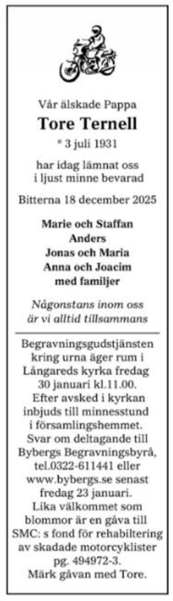 I mitten av januari avled en av SMC:s tidigare ordförande Tore Ternell, 94 år gammal. Tore var en kraft som under sina sex år som ordförande 1980-1986 förändrade organisationen från grunden och bidrog till att göra SMC till vad vi är idag. Tore ledde SMC under en MC-boom som saknar motstycke. Antalet motorcyklar i trafik ökade från 56 000 till 105 000. Medlemsantalet tredubblades från 13 725 till 39 875!