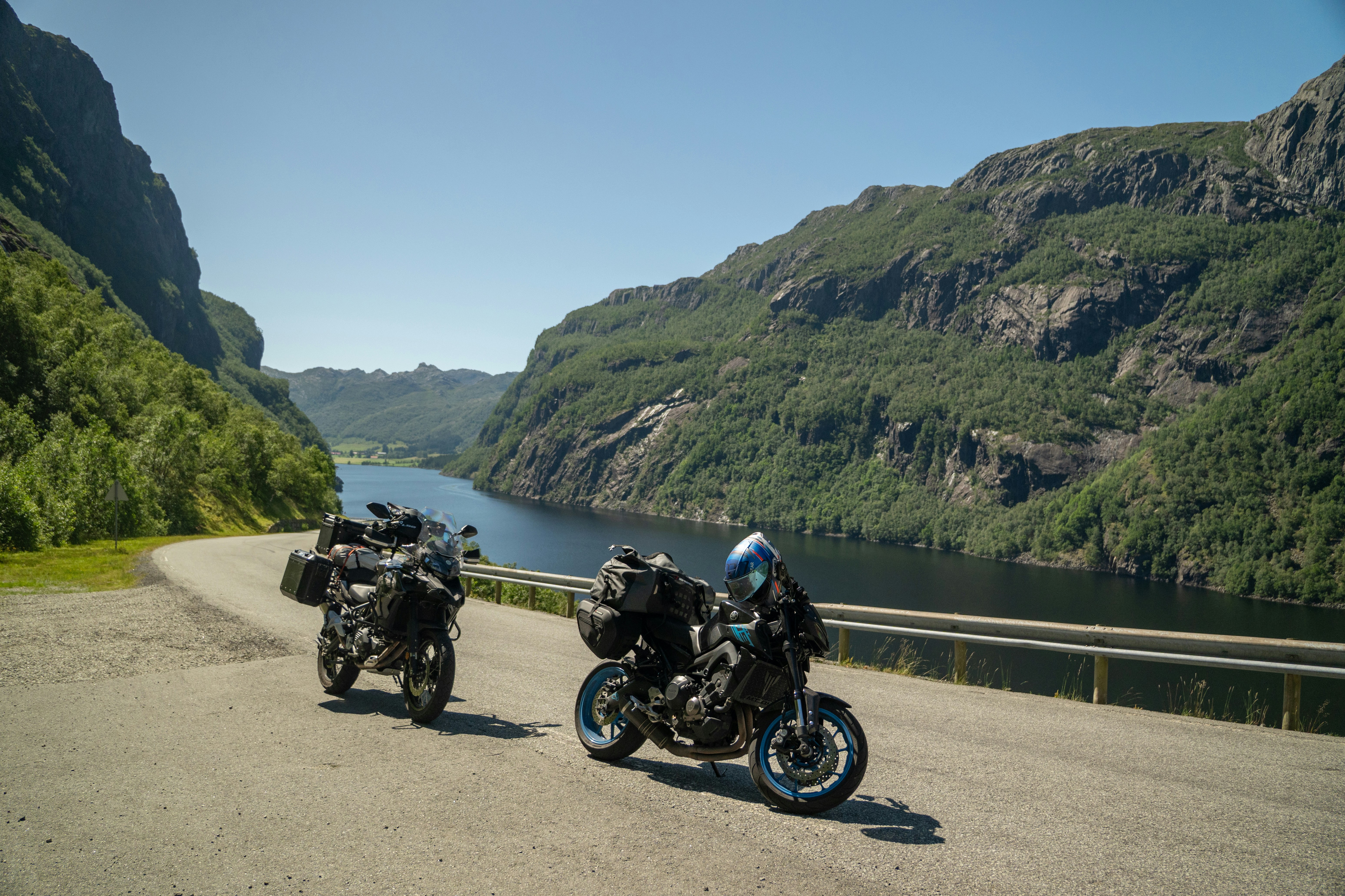 Bara väg, himmel, en och en annan ren, och ljudet av motorn. Och sen in i Norge – där landskapet exploderar i fjäll, fjordar och oändliga kurvor.